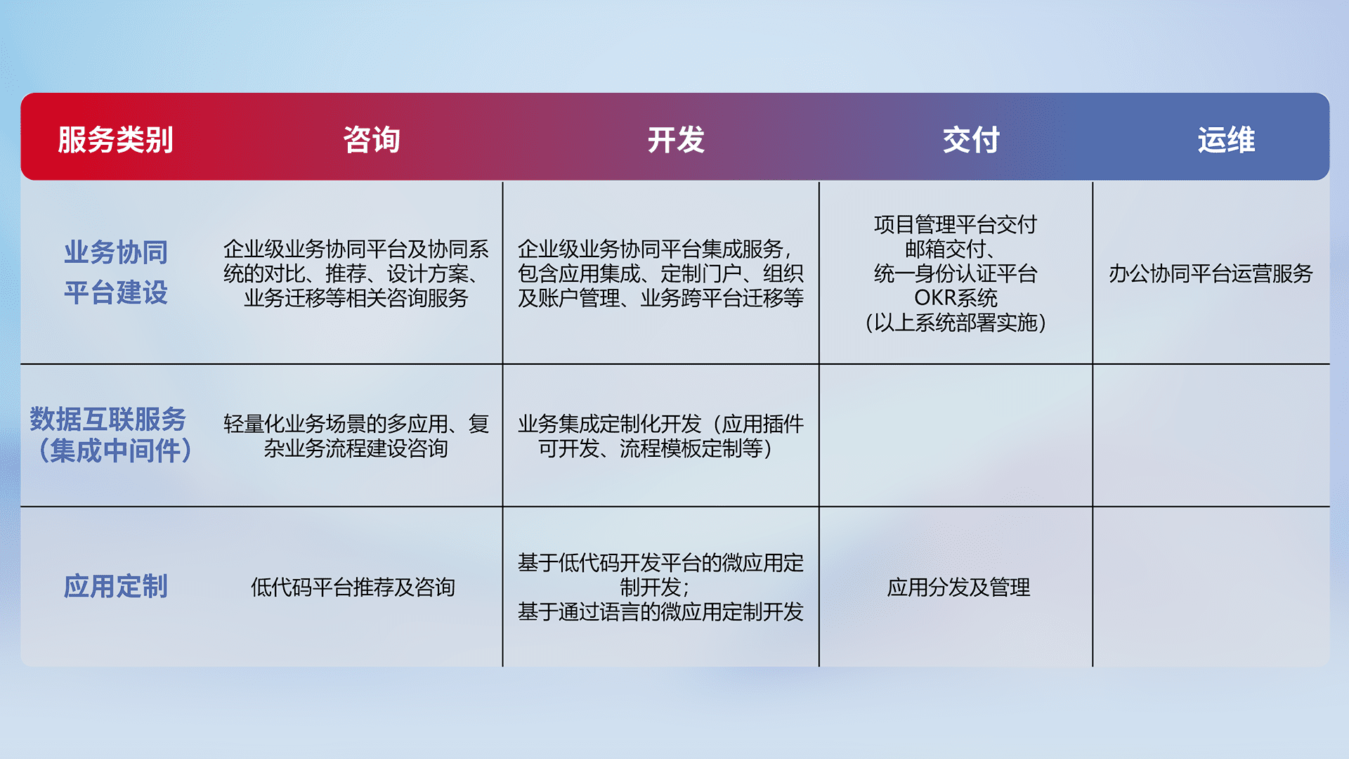 针对钉钉、、、企微、、、IDaas等平台级产品提供产品的规划、、方案、、、、交付、、、、定制化开发等服务,,实现如统一协同办公、、智能客户服务、、混合会议管理、、智能数据查询、、等业务场景,,,实现数字化转型。。